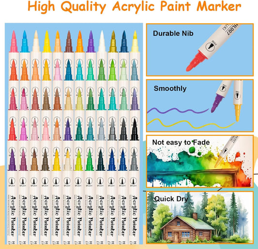 Marcadores de pintura acrílica de 48 colores, punta doble con punta fina y punta de pincel para piedra, madera, caligrafía, lienzo, cerámica, metal, vidrio, pintura rupestre, kit de suministros