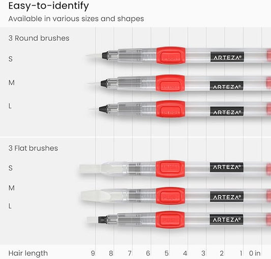 ARTEZA Cepillo de agua, juego de 6, puntas de cerdas de nailon suave surtidas, cepillo de agua autodhumedecente, bolígrafo de agua recargable