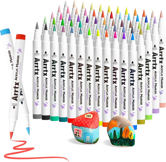 Arrtx Bolígrafos de pintura acrílica de 60 colores, rotuladores de pintura, punta de pincel para pintura roca, madera, lienzo, piedra, cerámica, suministros de arte para manualidades, con neón,