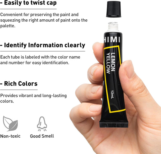 HIMI Juego de pintura acrílica, 18 colores, tubos de 0.4 fl oz, pintura a base de agua de alta viscosidad, suministros de arte para pintar lienzo, tela, madera y papel