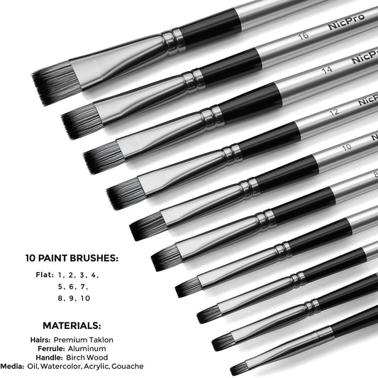 Nicpro Juego de 10 pinceles planos para pintura artística, pinceles para acuarela acrílica, óleo, gouache, detalles de manualidades, pintura facial, cuerpo, kit de artista para niños y adultos