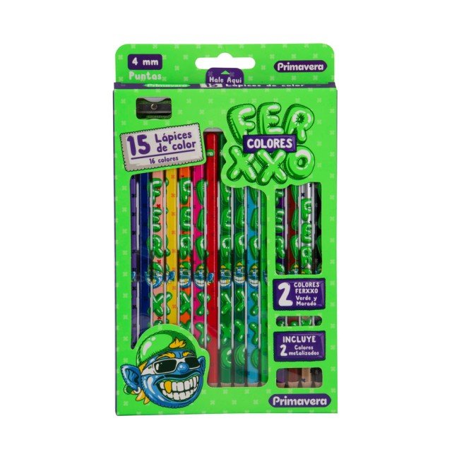 - Te incluye 16 colores: 1 crayón de doble punta con 2 colores metalizados. 2 colores FERXXO: verde y morado.