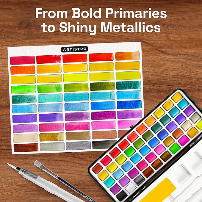 - 50 tonos de acuarela vibrantes: el juego de pintura de acuarela Artistro incluye 50 colores ricos y vivos, perfecto para principiantes, estudiantes y artistas profesionales. Crea todo, desde lavados suaves hasta obras de arte audaces y expresivas.