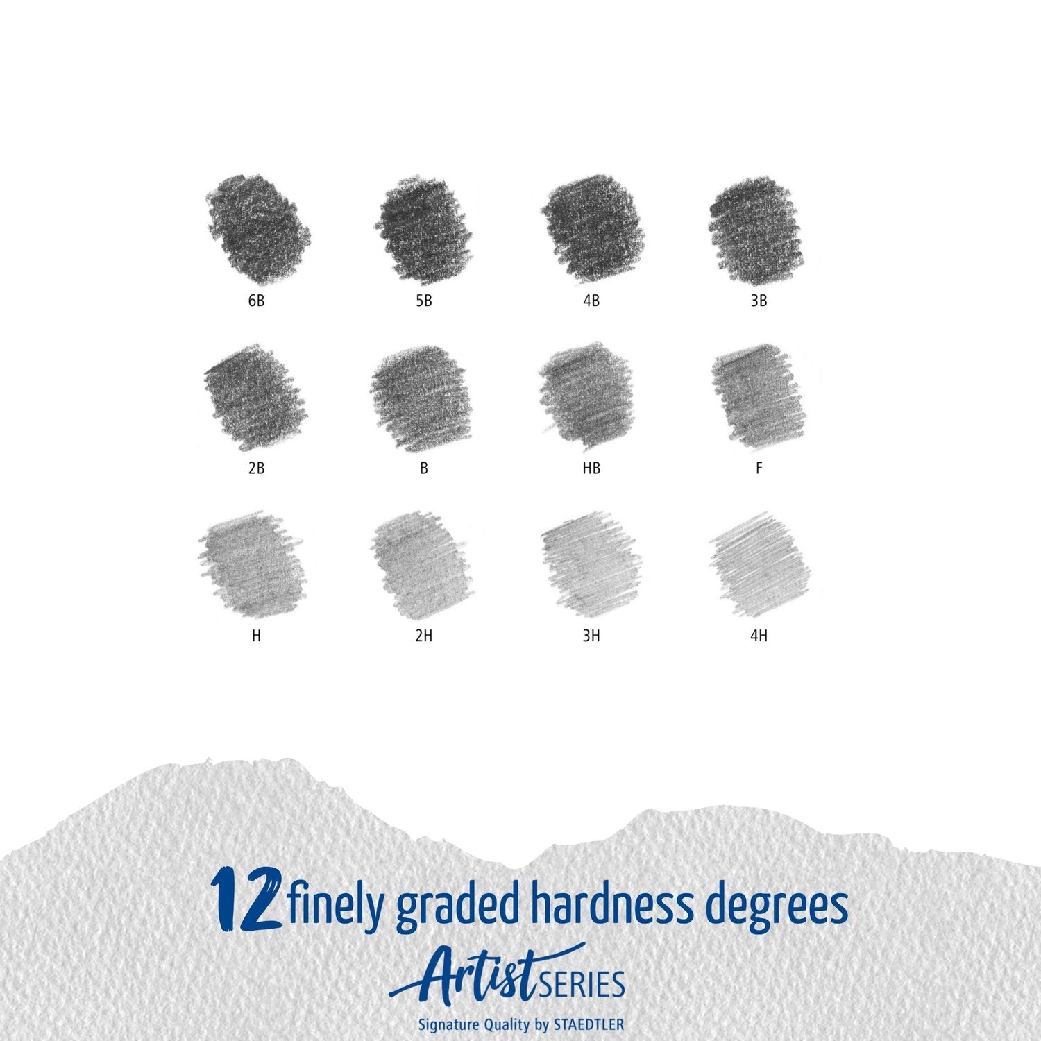 - Disponible en 24 graduaciones consistentes de graduación fina: 12B, 11B, 10B, 9B, 8B, 7B, 6B, 5B, 4B, 3B, 2B, B, HB, F, H, 2H, 3H, 4H, 5H, 6H, 7H, 8H, 9H y 10H