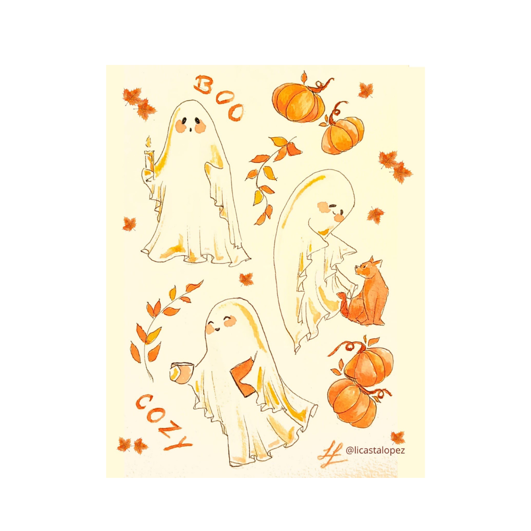 Hojita de stickers ilustrada por Licasta López, con adorables fantasmitas de estilo cozy que celebran el otoño entre calabazas, hojitas y momentos tranquilos. Perfecta para decorar tu journal, agenda, cartas o empaques con un toque cálido y festivo.